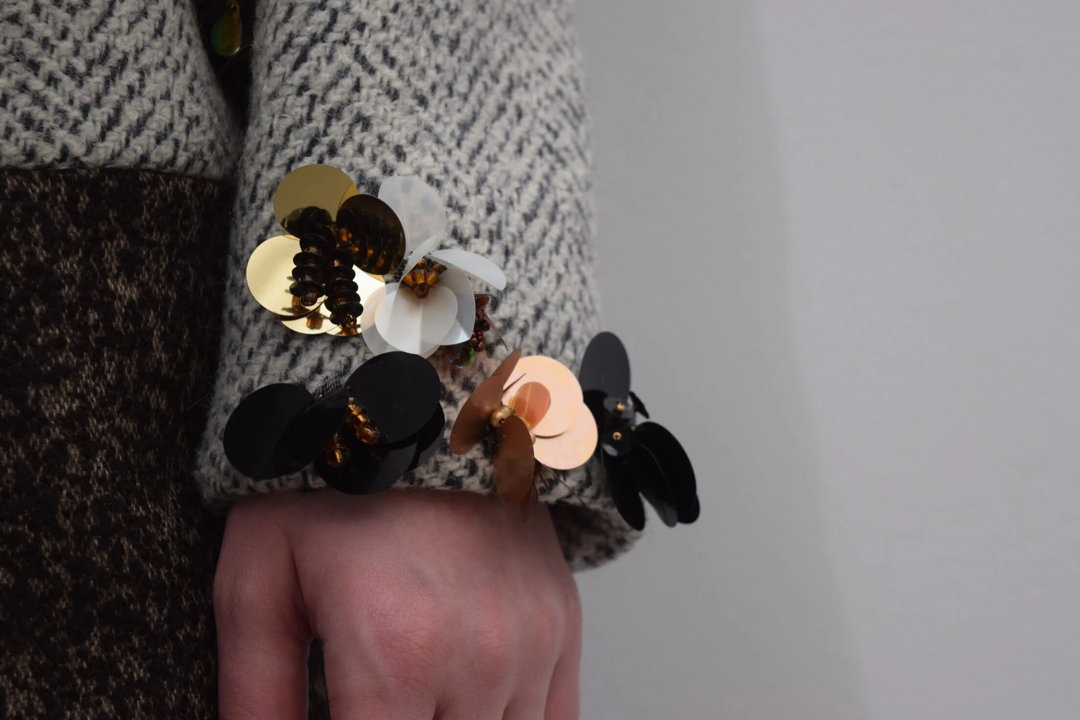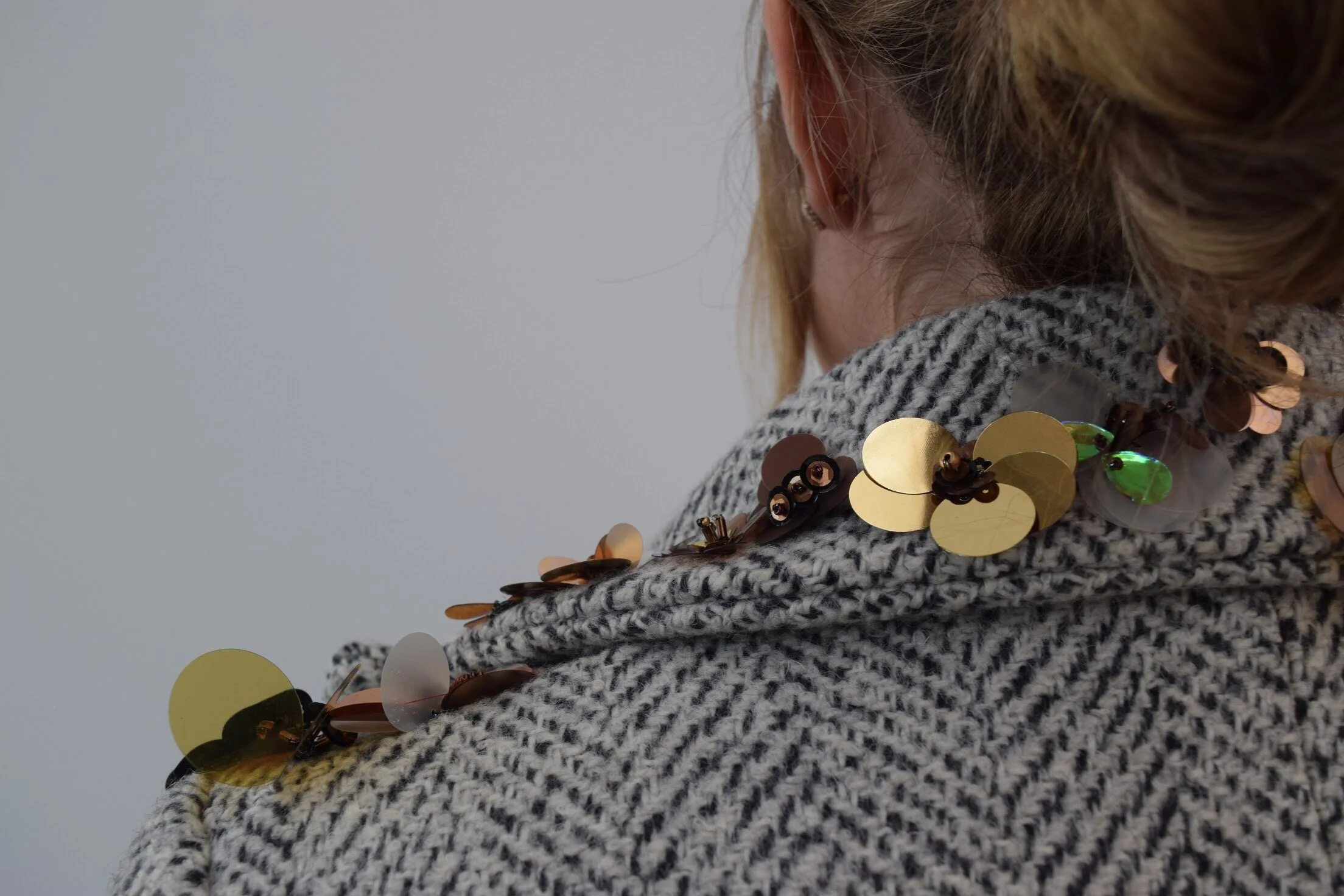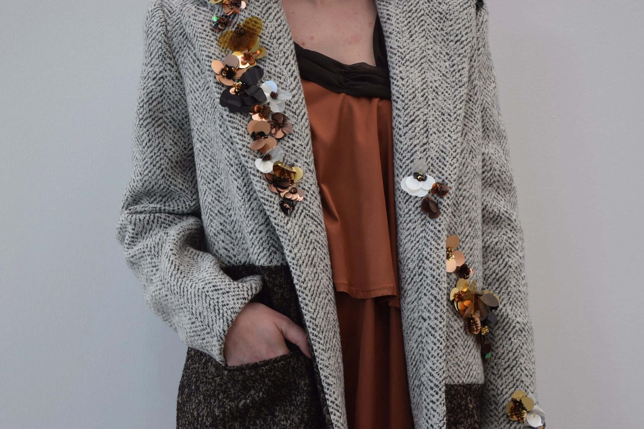 My main focus of this coat is asymmetry and sleek lines. The idea that your eye can spiral down well looking at this coat. My professor really helped me focus on the placement of the flowers and how to use them to deliver a message to the eye. I enjoyed every moment of making this coat. It was so rewarding to see the finished product and came together like magic.