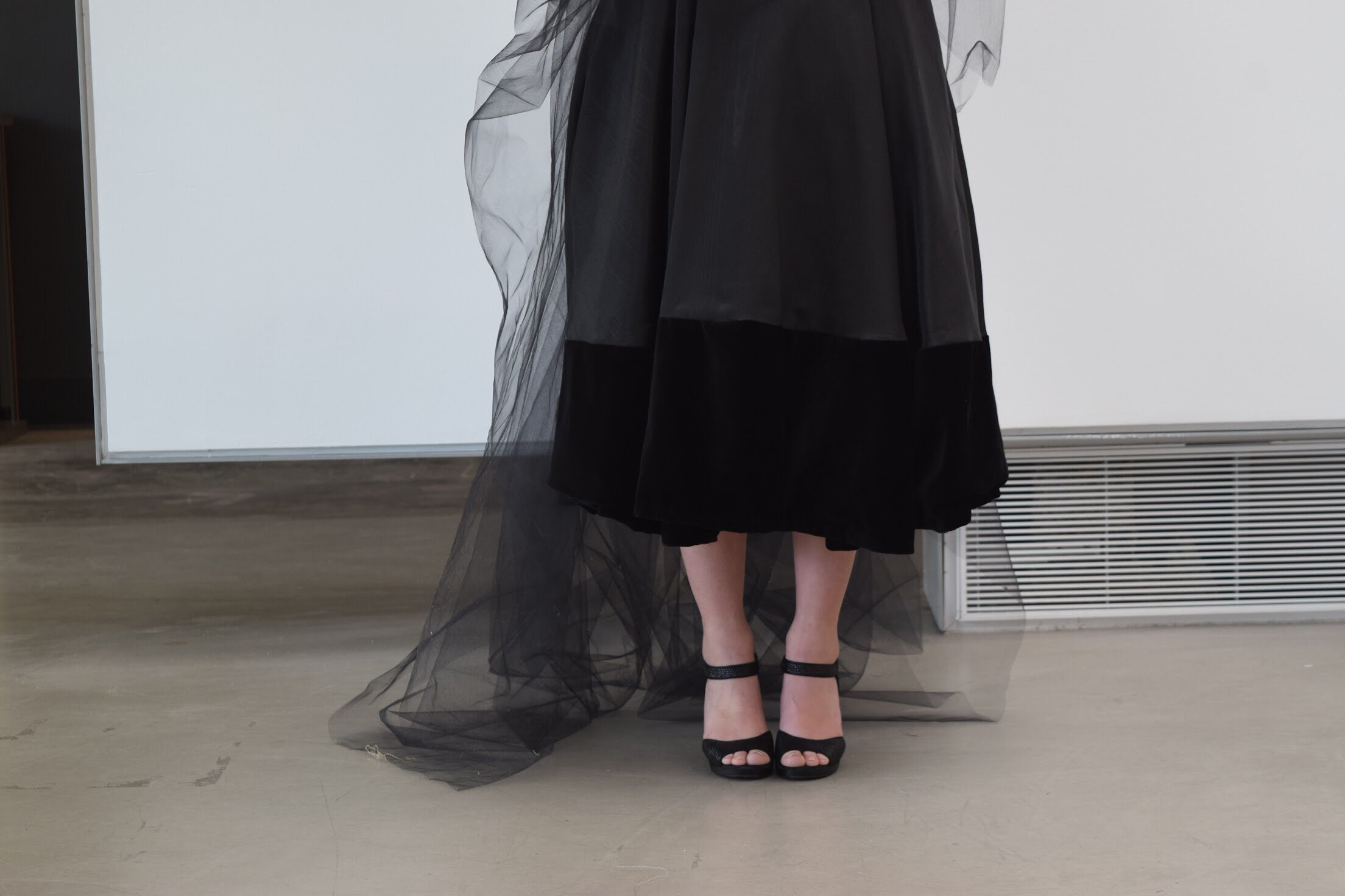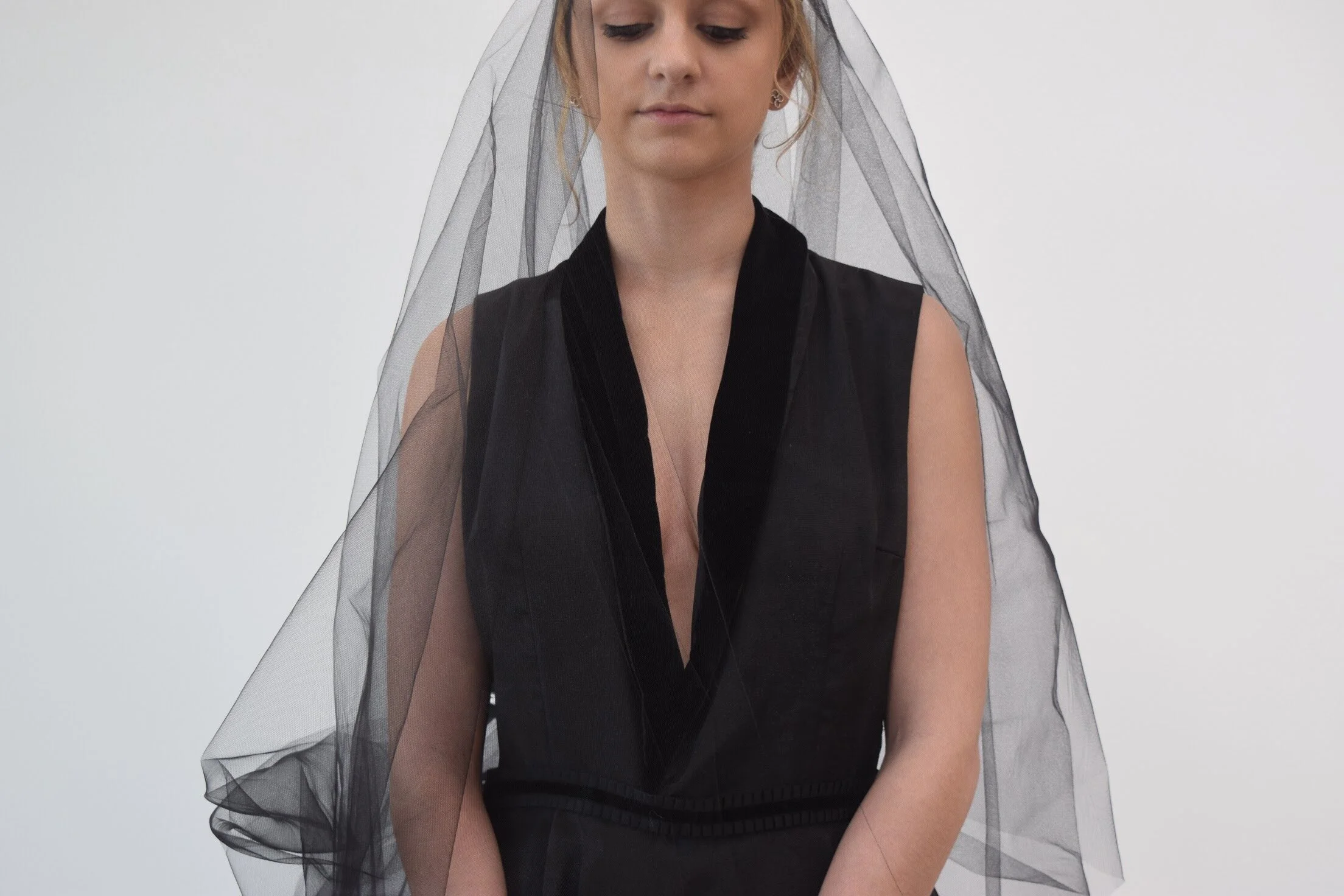 My concept for this piece came to me very fast. I’ve always had a real fascination with death. My mother named me after Jackie Kennedy (or so she claims) and I would always be fascinated with the death of JFK and the relationship she has with her husband and Marilyn Monroe. This piece is about funeral attire and the different stages of mourning in the 1800’s. It was very important to me that I create a veil to protect the emotions of the wearer. Black moire fabric and black velvet fabric have different textures and shines that would represent how different fabrics are used in 1800’s mourning wear.