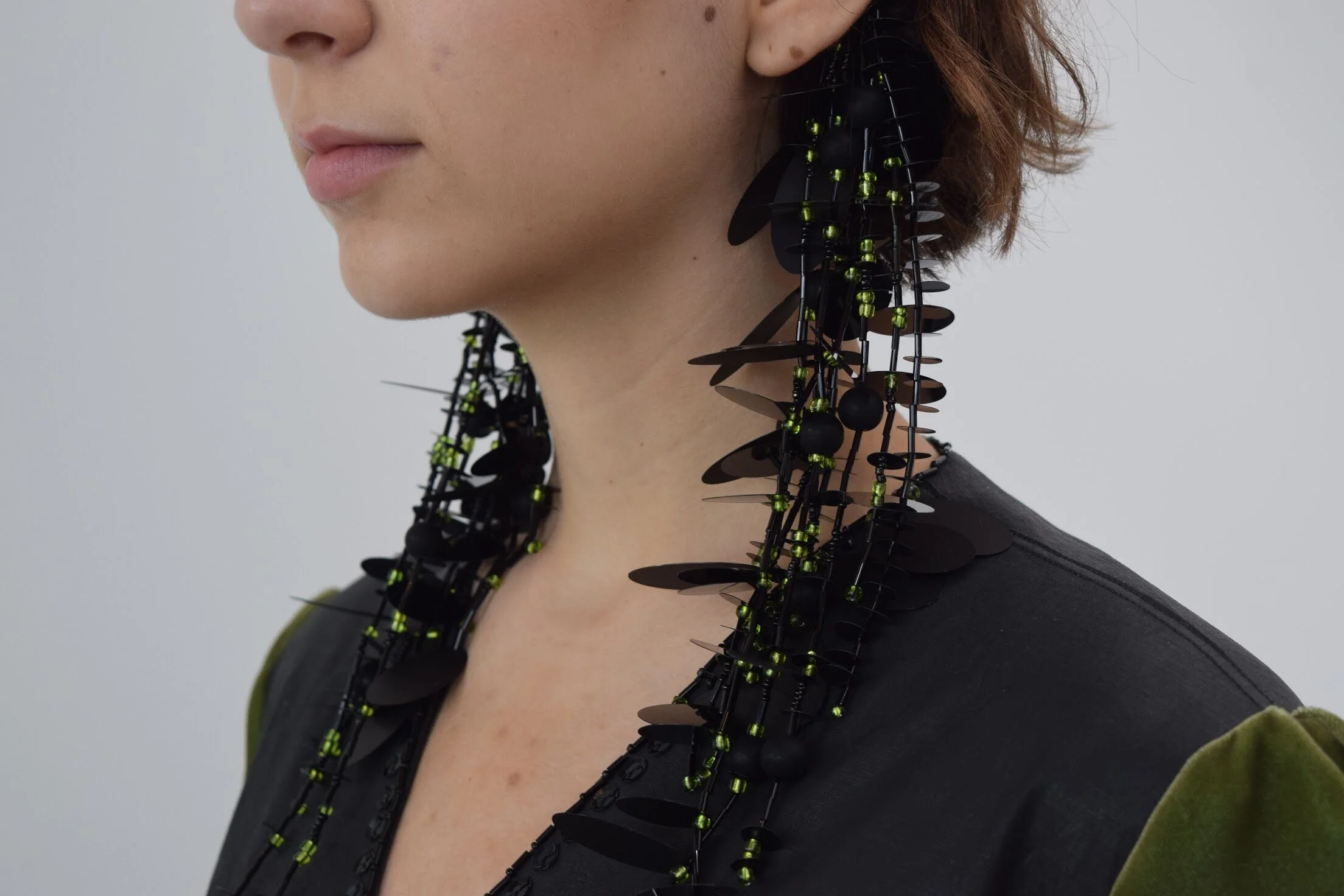 This look was my final look that I created for the semester. I was out of steam. This look is something that I think really defines my style and aesthetic. Sleek and simple lines with fine detail in beading. I ordered the fabric because I loved it and had NO clue what I was going to do with it. Half way through making it friends started telling me how much it reminded them of Game of Thrones. I immediately saw it and now can’t look at it without thinking of Sansa Stark. Strong and powerful women tend to always be my inspiration for the pieces that I create.