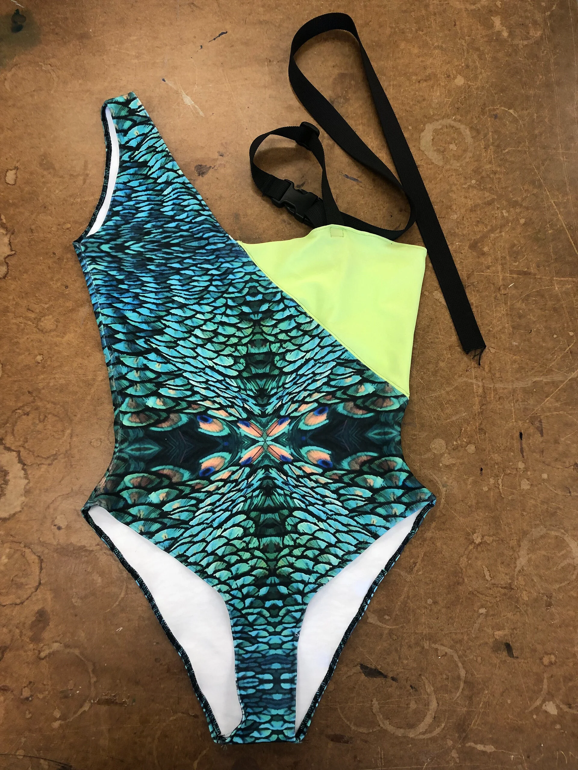 Mood board and fashion flats done in Adobe Illustrator/Photoshop. Color block swimsuit with neoprene and nylon fabric and stretch thread. Webbing buckle strap detail. Cover up made of nylon tulle with pleating and webbing buckle belt detail.