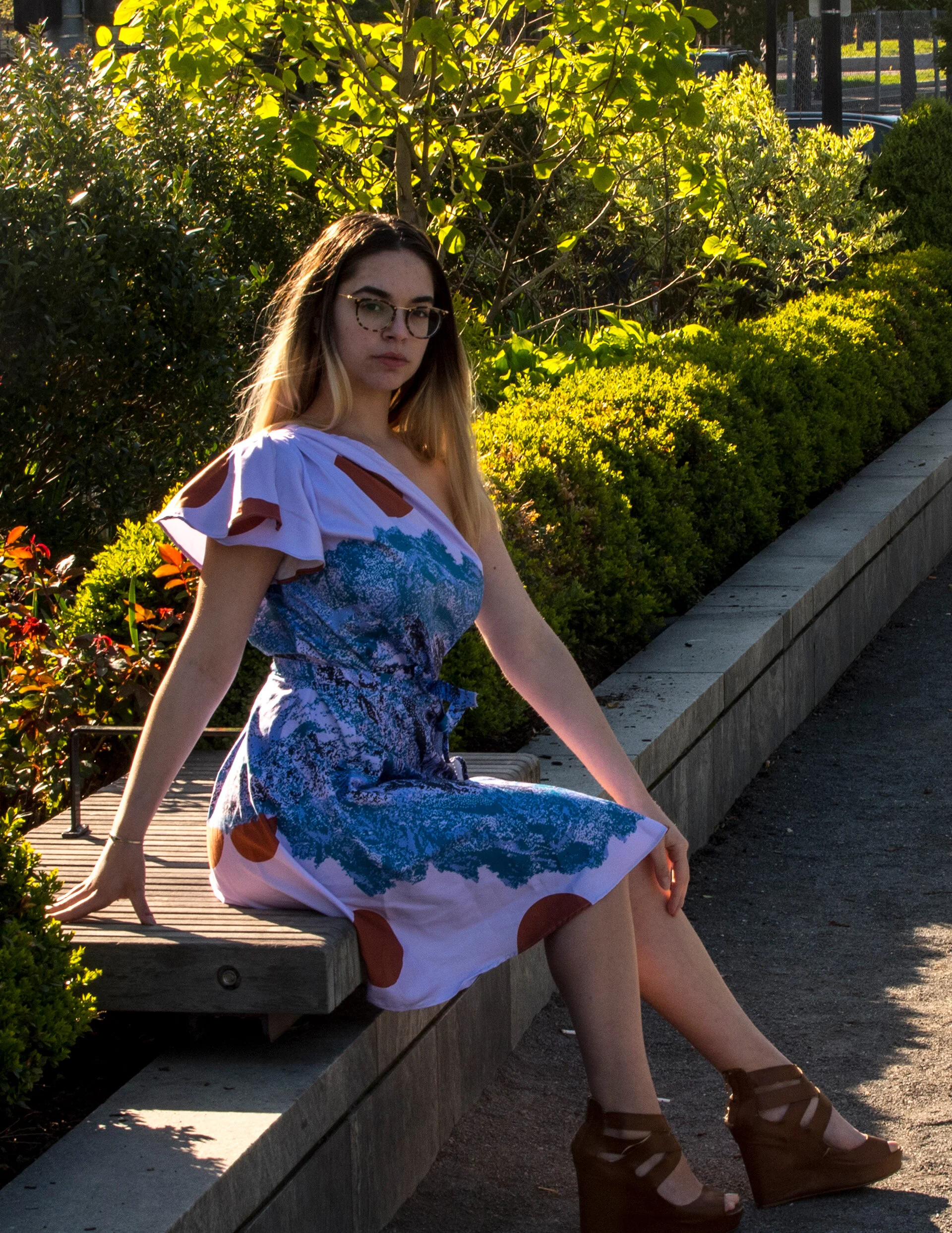 Border pattern, flat, and mood board done in Adobe Illustrator/Photoshop. Printed on Cotton Sateen. Wrap skirt and one shoulder top with side zipper and a petal sleeve.