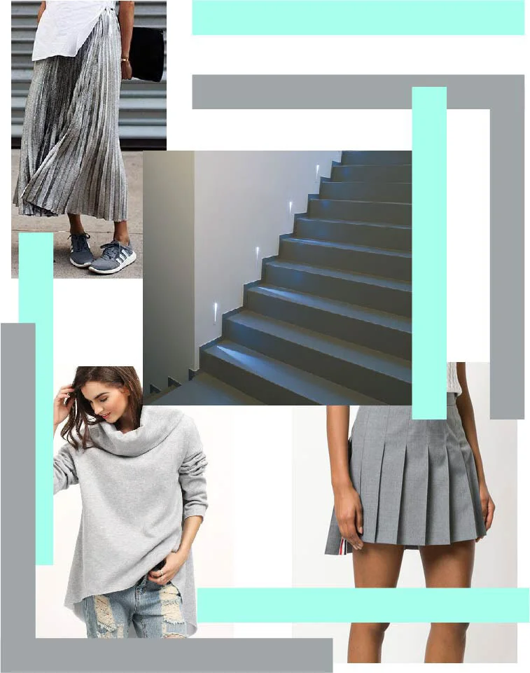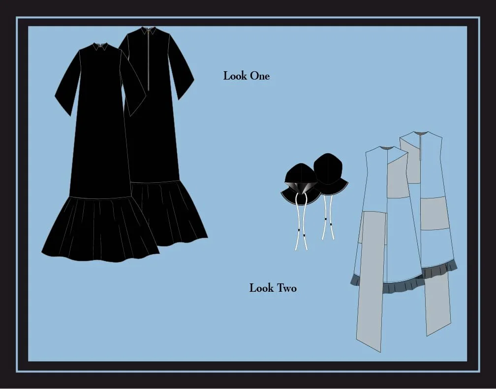 Mood board and fashion flat done in Adobe Illustrator/Photoshop. Shirt, back attachment, and skirt all made with rectangles and circles. High collar neck rectangular shirt with circles folded in half sewn in as a cap sleeve. Zipper down center back with a pleating detail back attachment that snaps on and off. Elastic waist skirt with pleating detail.