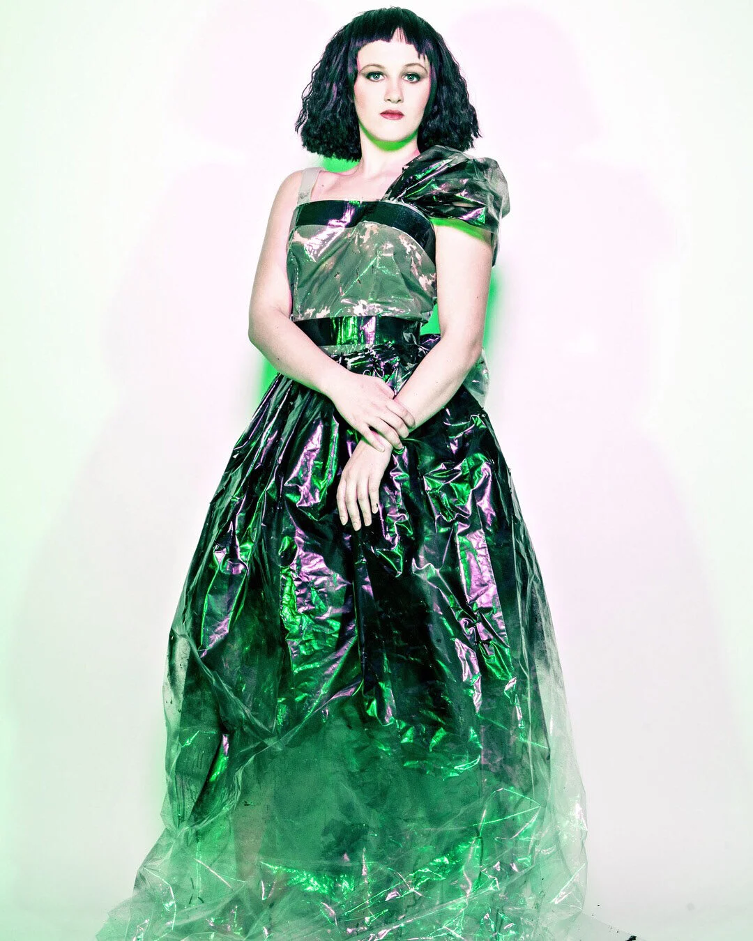 Fashion flat done in Adobe Illustrator. Made of plastic shower curtains, black Duck Tape, and spray paint. Shirt with exaggerated sleeve, belt with bow, and three layer skirt with pleating detail at waist.